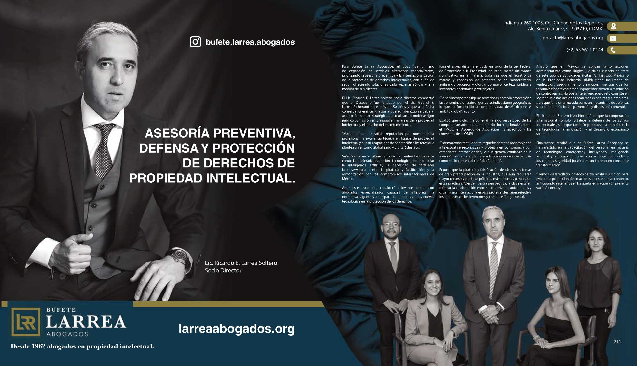 Para Bufete Larrea Abogados, el 2025 fue un año de expansión en servicios altamente especializados, priorizando la asesoría preventiva y la internacionalización de la protección de derechos intelectuales, con el fin de seguir ofreciendo soluciones cada vez más sólidas y a la medida de sus clientes.