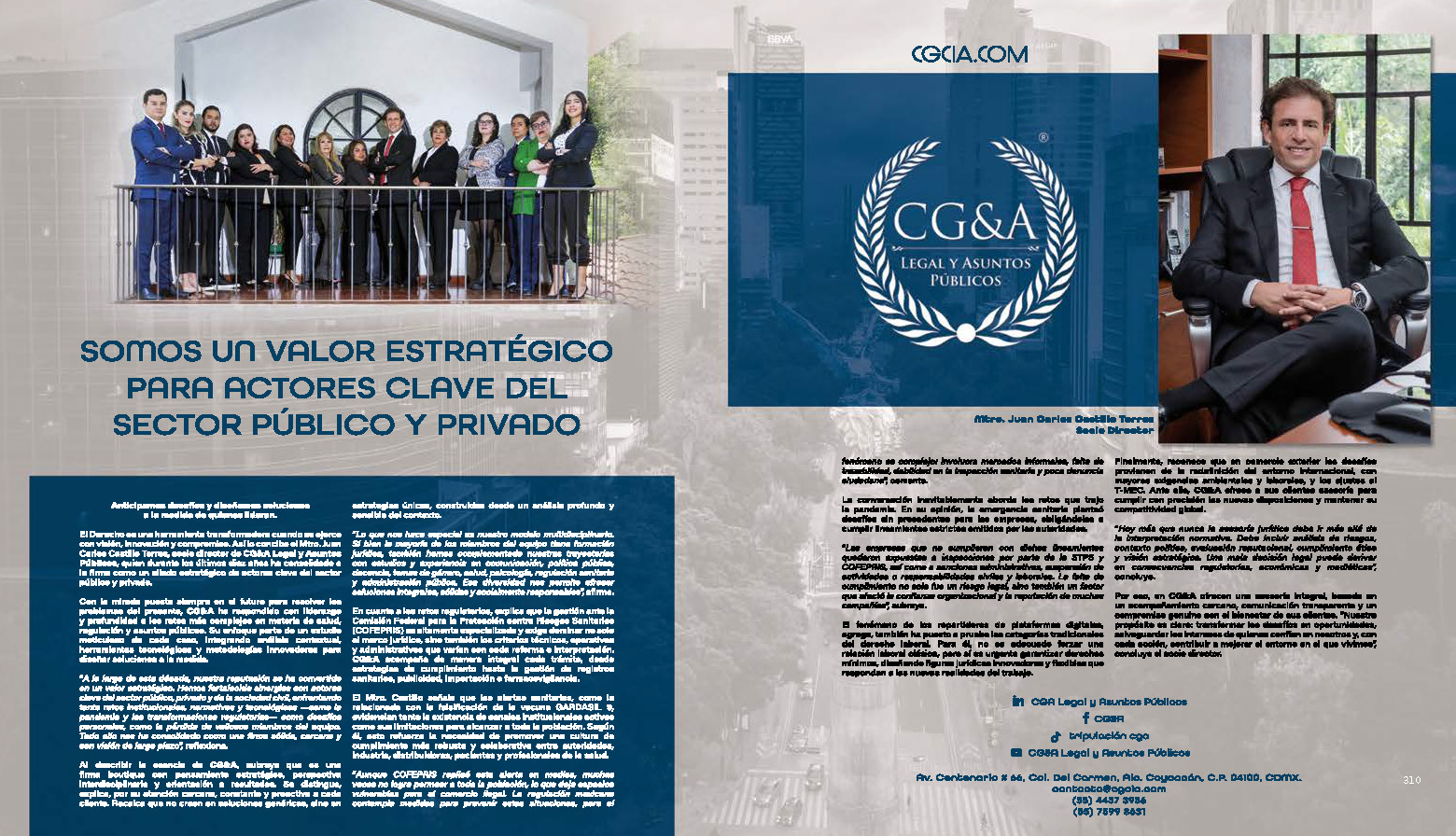 Al describir la esencia de CG&A, subraya que es una firma boutique con pensamiento estratégico, perspectiva interdisciplinaria y orientación a resultados. Se distingue, explica, por su atención cercana, constante y proactiva a cada cliente. Recalca que no creen en soluciones genéricas, sino en estrategias únicas, construidas desde un análisis profundo y sensible del contexto.