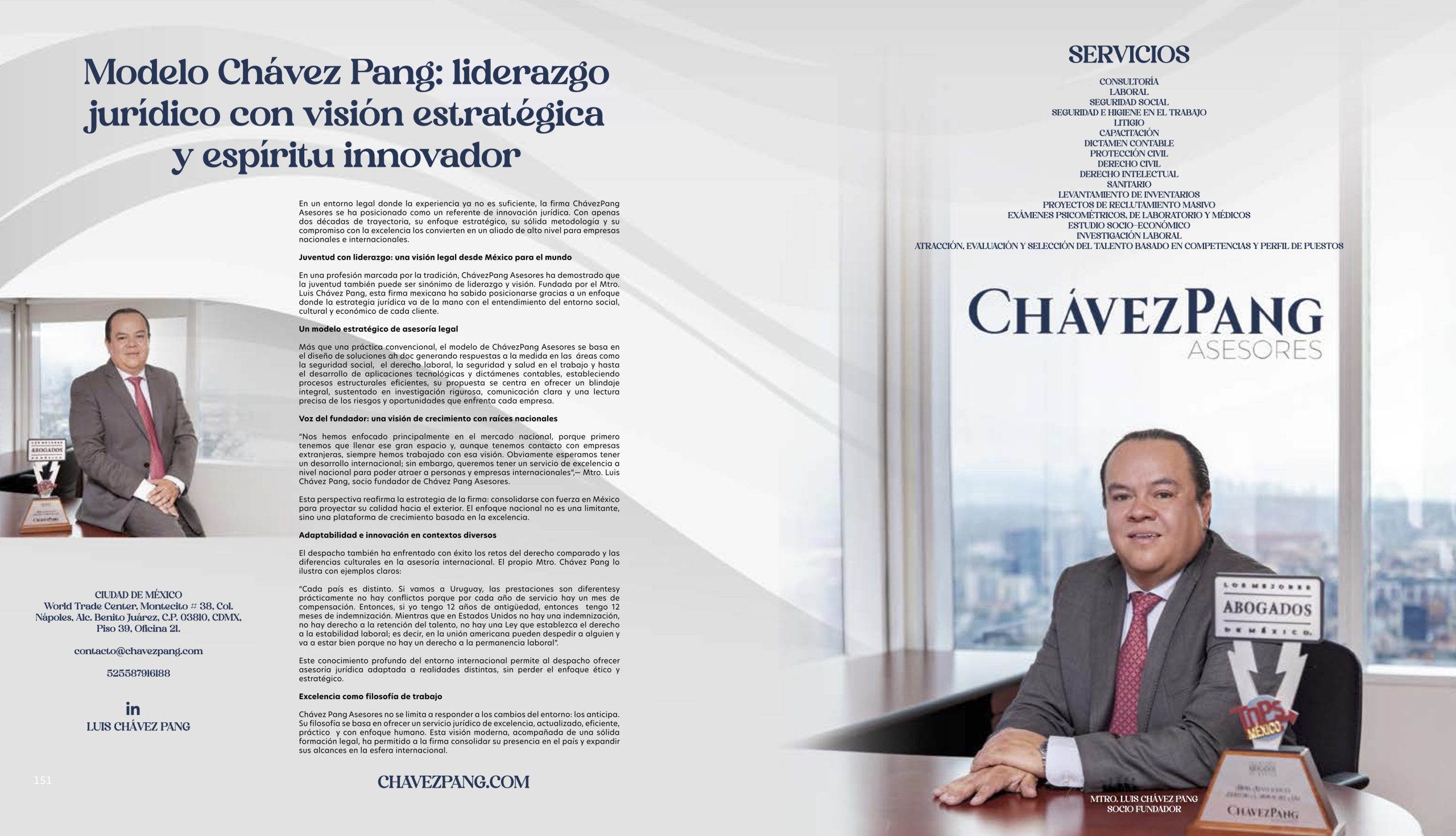 Más que una práctica convencional, el modelo de ChávezPang Asesores se basa en el diseño de soluciones ah doc generando respuestas a la medida en las áreas como la seguridad social, el derecho laboral, la seguridad y salud en el trabajo y hasta el desarrollo de aplicaciones tecnológicas y dictámenes contables, estableciendo procesos estructurales eficientes, su propuesta se centra en ofrecer un blindaje integral, sustentado en investigación rigurosa, comunicación clara y una lectura precisa de los riesgos y oportunidades que enfrenta cada empresa.