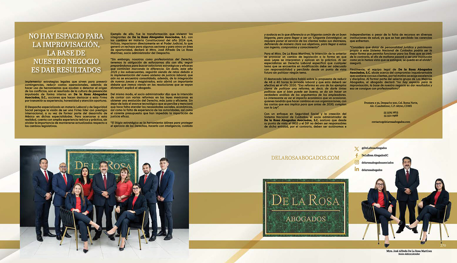México es un país que se preocupa por sus trabajadores, reconoce la labor de los empresarios y es un referente para las inversiones y fuentes de empleo, es por ello que De La Rosa Abogados Asociados, S.C. fortalece la confianza de los inversionistas con soluciones integrales que cumplan con cada uno de sus objetivos, aseguró el Mtro. Alfredo De La Rosa Martínez, socio de la Firma.
