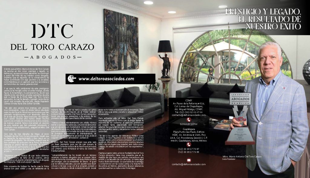 Frente a nuevos retos, el socio fundador de Del Toro Carazo Abogados tiene muy presente que en la medida de que haya una persona inocente en una prisión y se requiera de sus servicios, su tarea legal nunca habrá terminado. Lo que habla de su entrega y compromiso con las causas justas y la impartición de justicia en México, elementos de gran relevancia que demuestran su valía como Firma legal.