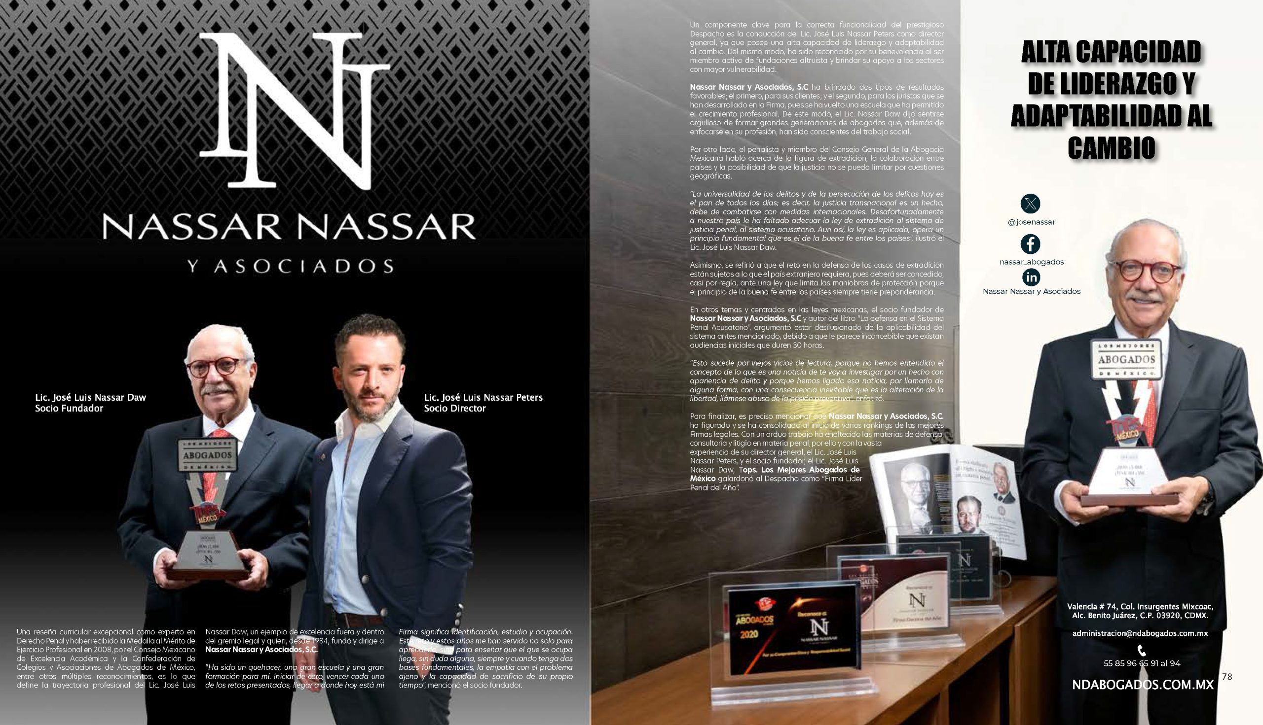 Para finalizar, es preciso mencionar que Nassar Nassar y Asociados, S.C. ha figurado y se ha consolidado al inicio de varios rankings de las mejores Firmas legales. Con un arduo trabajo ha enaltecido las materias de defensa, consultoría y litigio en materia penal, por ello y con la vasta experiencia de su director general, el Lic. José Luis Nassar Peters, y el socio fundador, el Lic. José Luis Nassar Daw, Tops. Los Mejores Abogados de México galardonó al Despacho como “Firma Líder Penal del Año”.