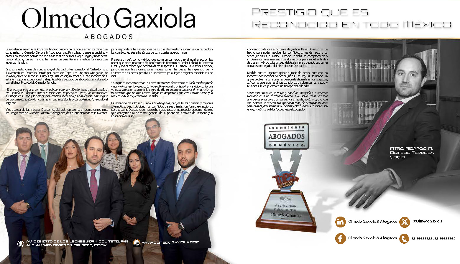 “Este logro es producto de nuestro trabajo, pero también del legado de mi papá, el Lic. Ricardo M. Olmedo Gaxiola. Él inició este Despacho en 1987 y, desde entonces, el trabajo en equipo y la preparación continua han sido fundamentales para lograr un crecimiento sostenido y mantener una irrefutable ética profesional”, recordó el litigante.