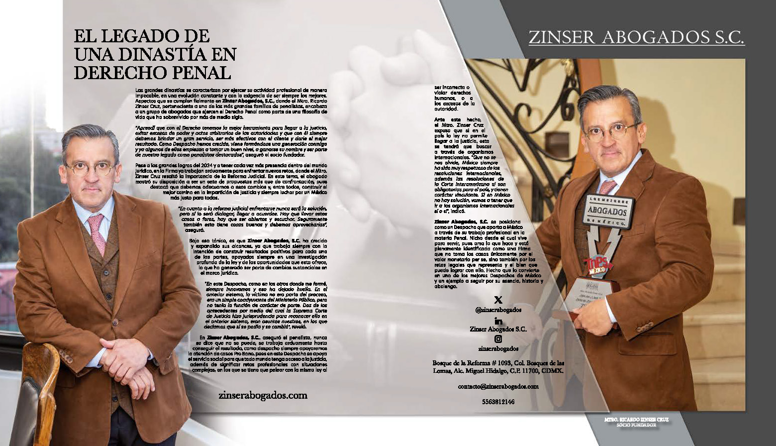 Ante ello, celebró que Zinser Abogados, S.C. cuente con un equipo especializado con un alto grado de humanismo con los clientes, dedicados tanto a la defensa de personas físicas y jurídicas que son investigados o procesados, así como al patrocinio legal de víctimas de delitos, siendo precursores en el área del Derecho Penal Preventivo, implementando el “Compliance Penal” en nuestro país.